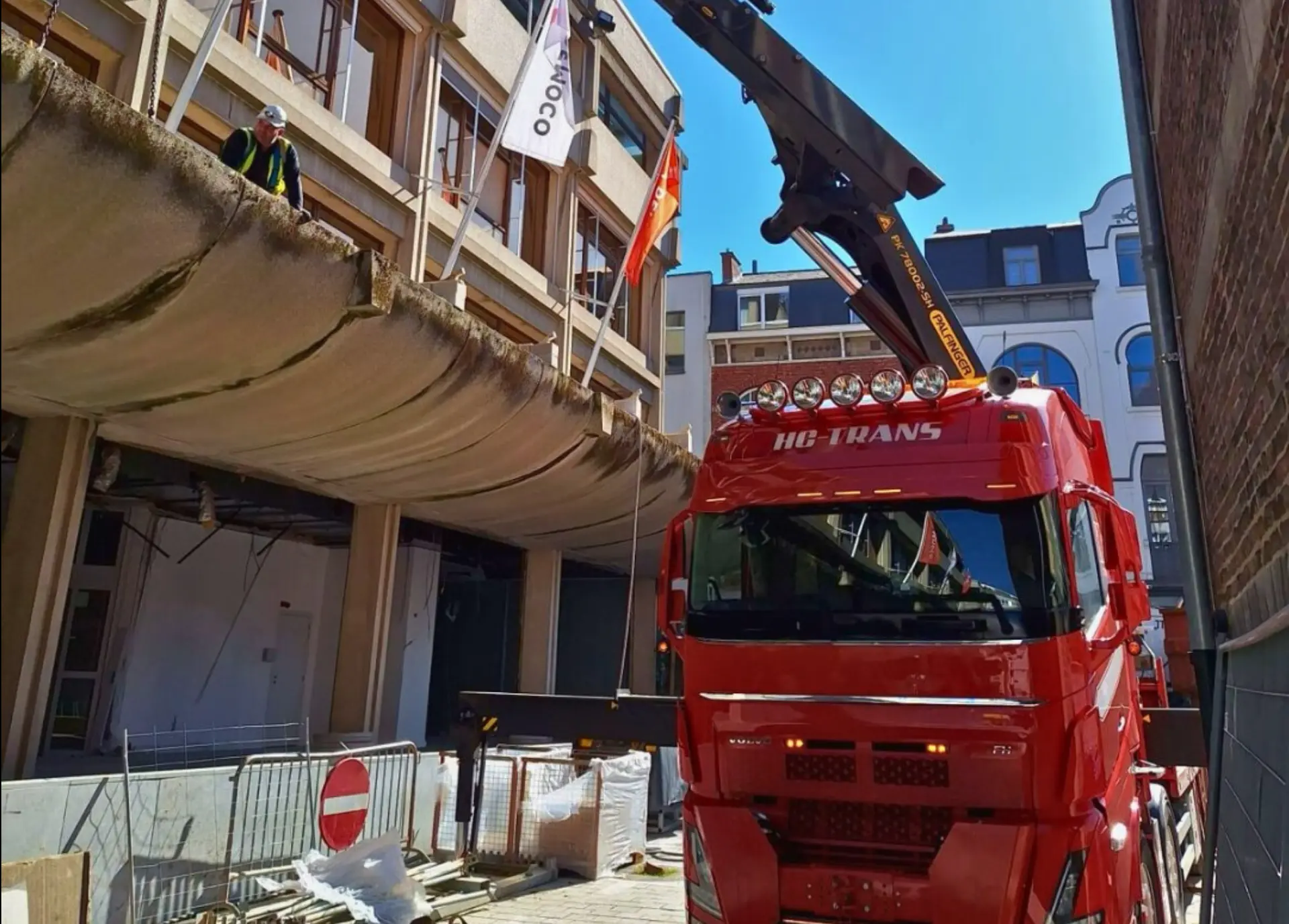 Op de werf "Kunsthuis" van Democo Bouwbedrijf hebben we met onze kraan enkele zware betonelementen veilig en precies van het gebouw gehaald. Zo'n delicate operatie in het midden van de stad vraagt voorbereiding en het juiste materiaal - en dat hadden we natuurlijk.